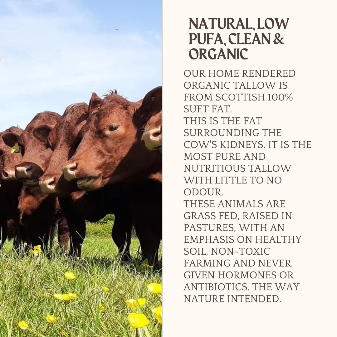 Tallow is non-comedogenic, ensuring easy absorption without clogging pores, while protecting it from environmental stressors and promoting elasticity . Ideal for dry skin, psoriasis, eczema, rashes, and minor sunburn, Tallow is like food for your skin.