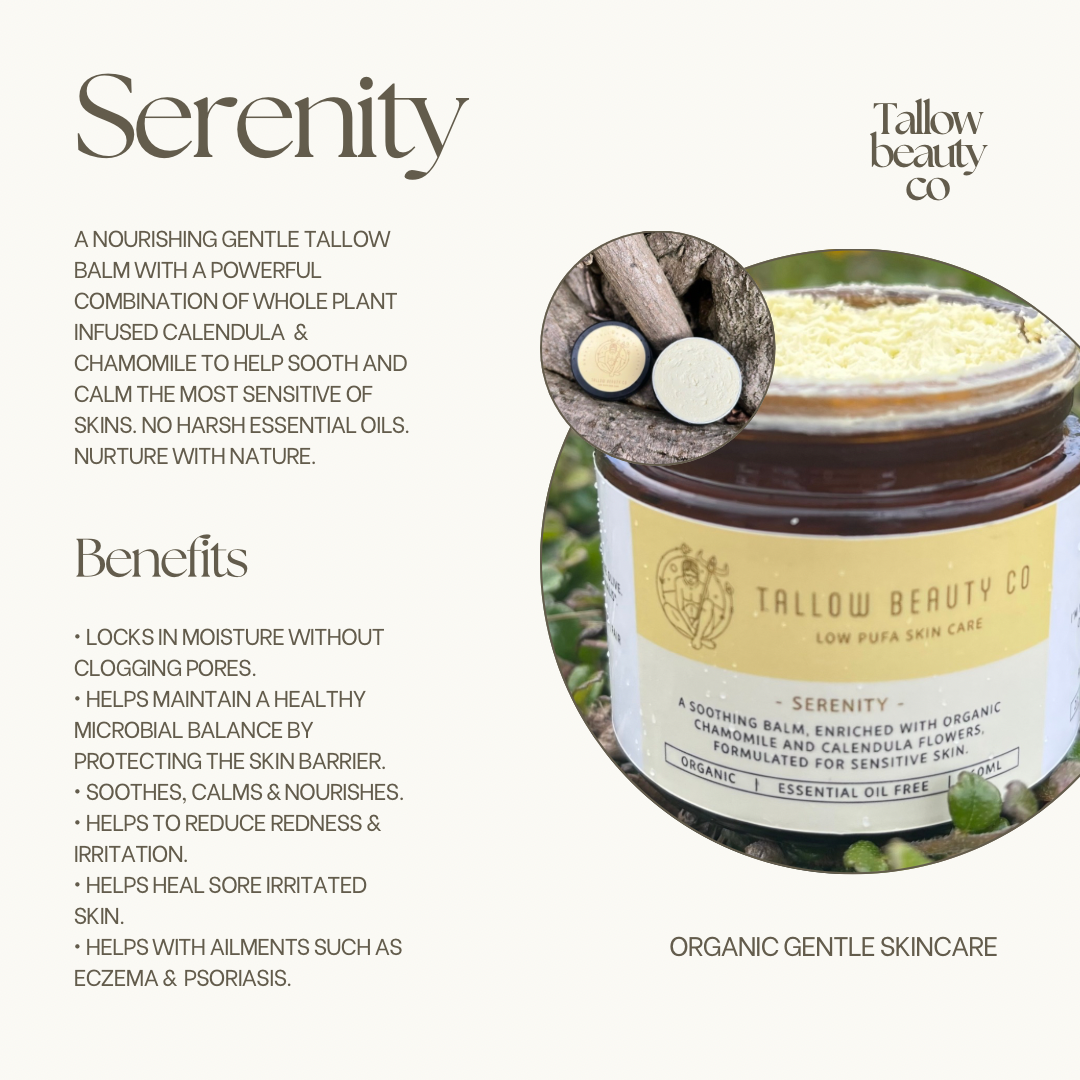 Serenity is our luxurious tallow balm infused with the soothing powers of organic chamomile and calendula.
